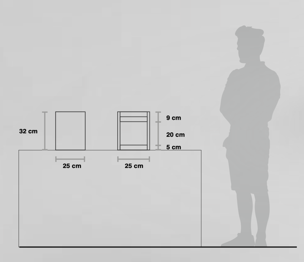 Dimensiones totales: 25x25x32 cmCarga por bandeja: 1 kgCarga global: 2 kgArea por bandeja: 24×23 cmMaterial: Carton 5.5mm