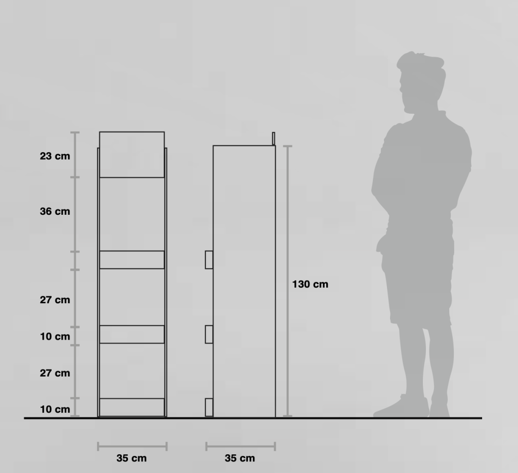 Dimensiones totales: 35x35x140 cmCarga por bandeja: 20 kgCarga global: 70 kgArea por bandeja: 33×33 cmMaterial: Carton 5.5mm